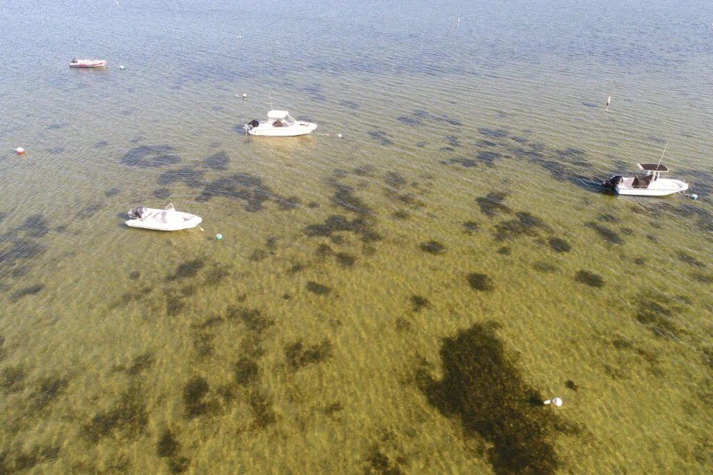Low elevation aerial imagery is the main source of information used to assess distribution and abundance of SAV in the Nantucket Harbor restoration plot.